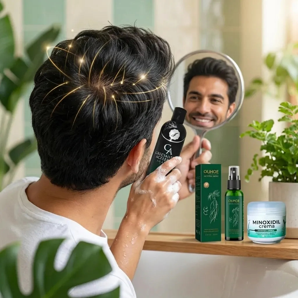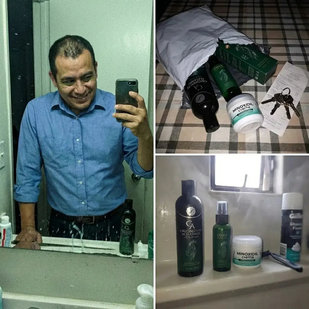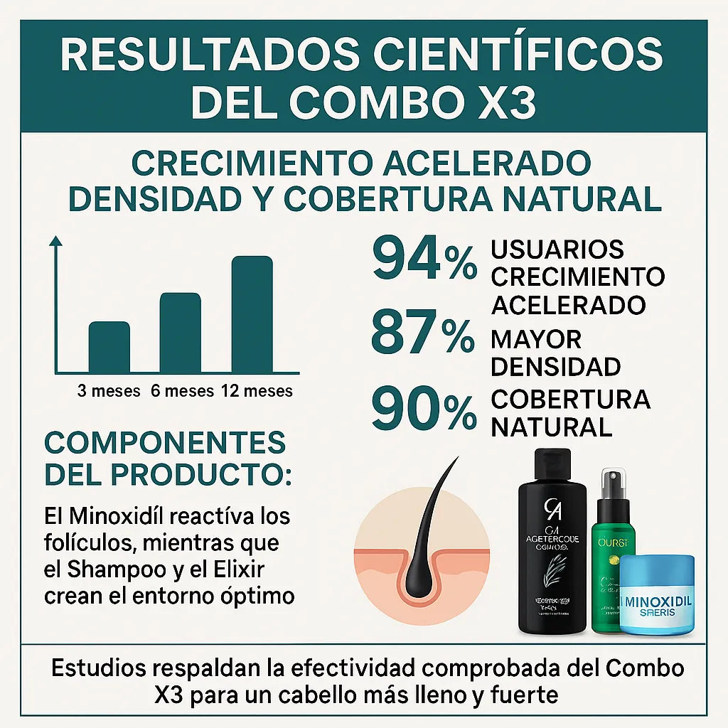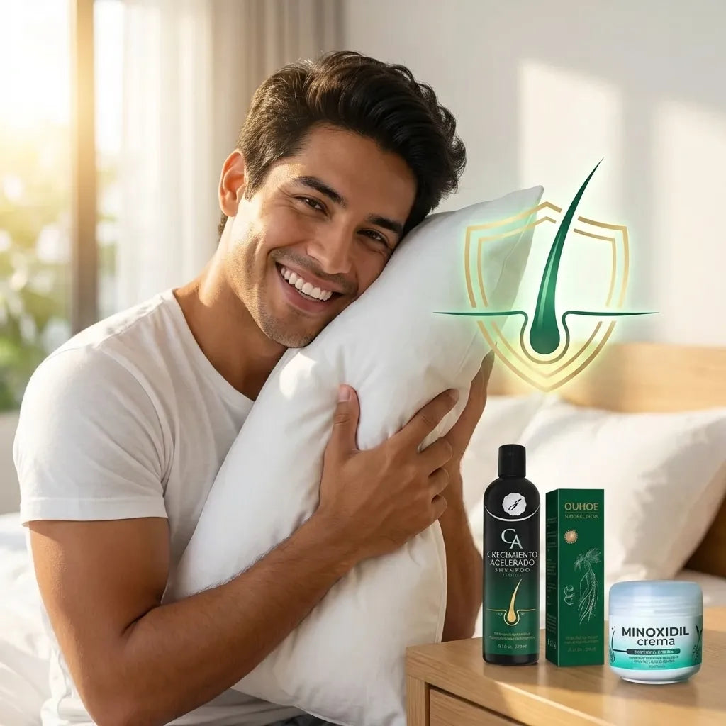 Reactivamos folículos inactivos con Minoxidil, la base científica, mientras el shampoo y elixir crean el ambiente perfecto para un crecimiento denso y acelerado.
