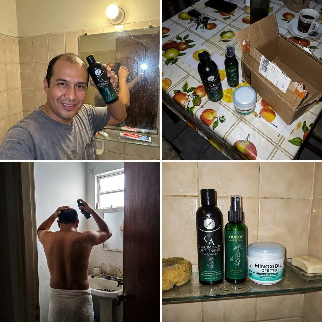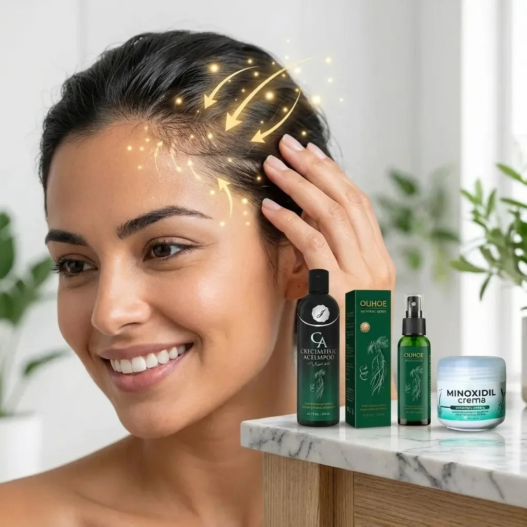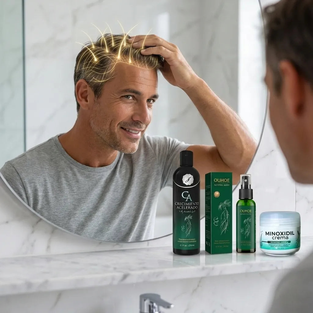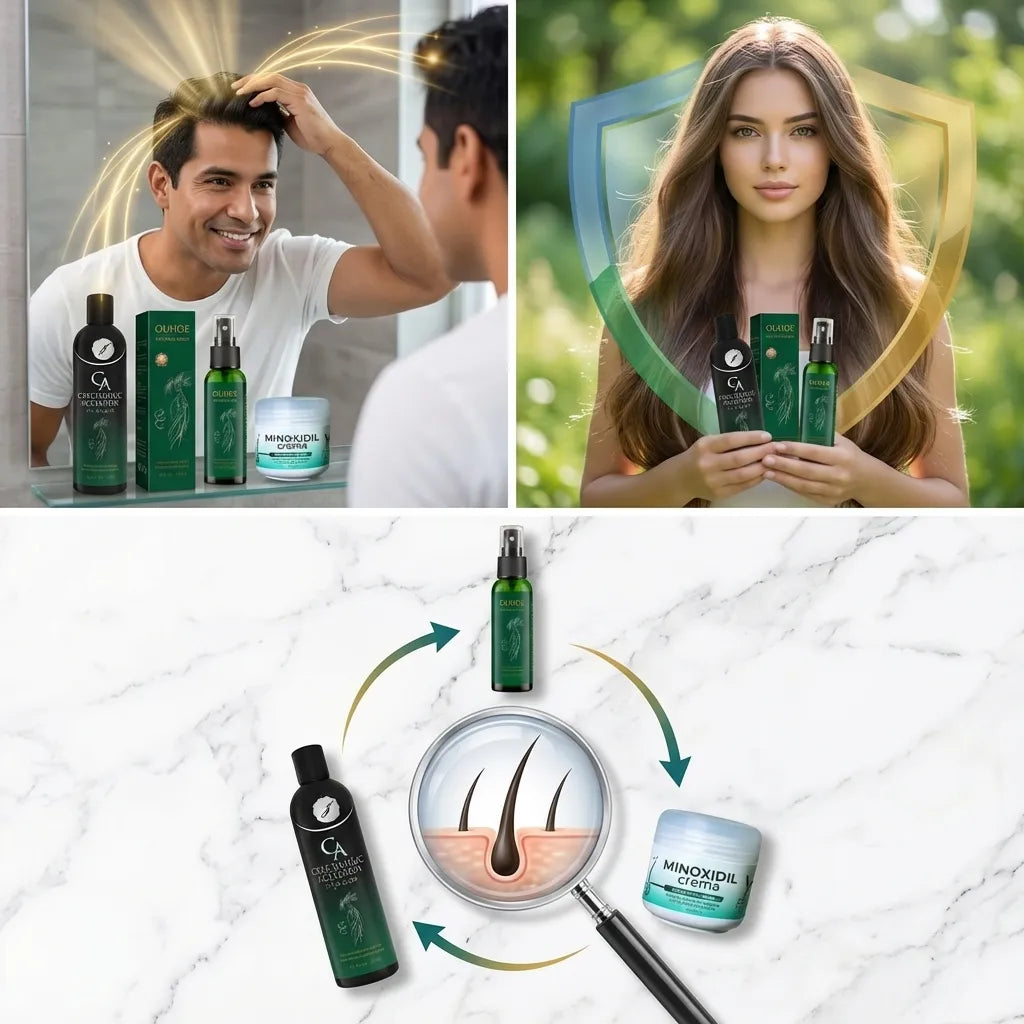 Reactivamos folículos inactivos con Minoxidil, la base científica, mientras el shampoo y elixir crean el ambiente perfecto para un crecimiento denso y acelerado.