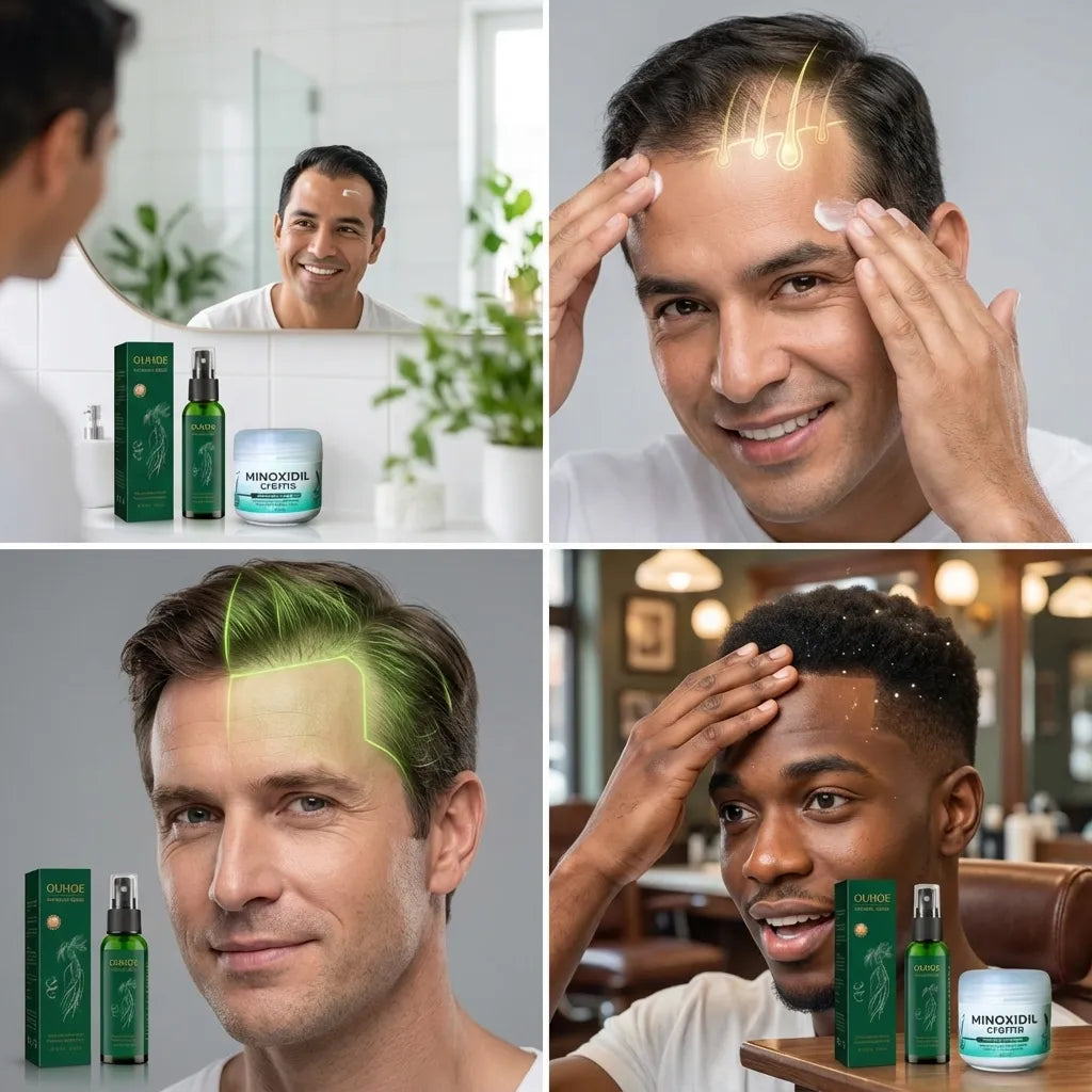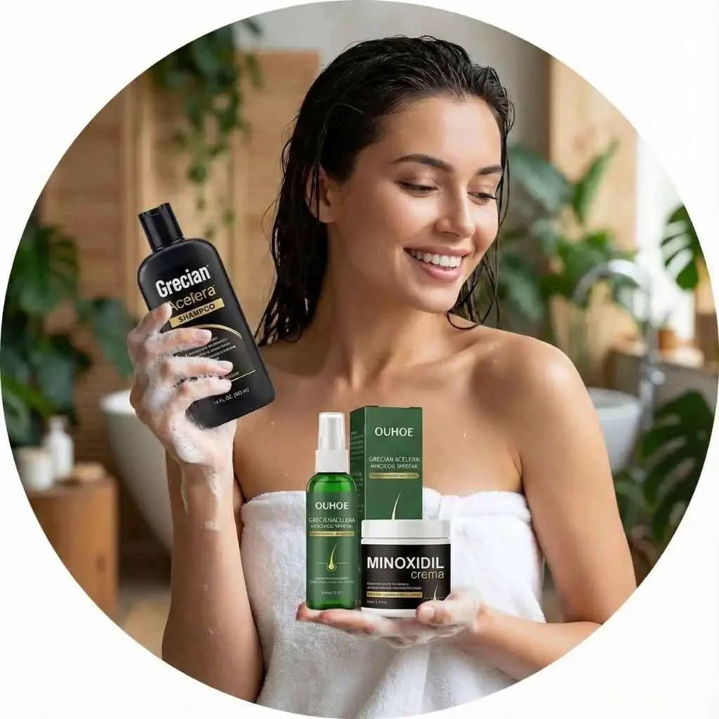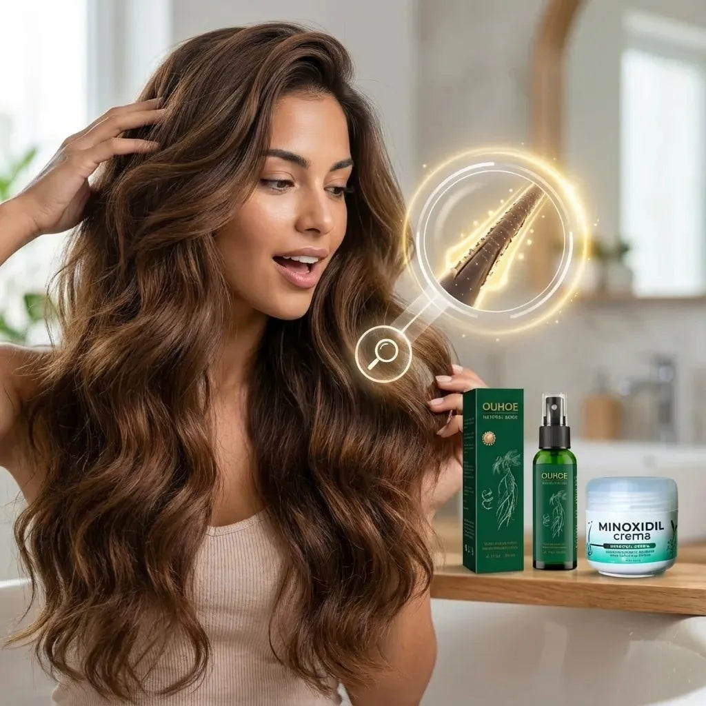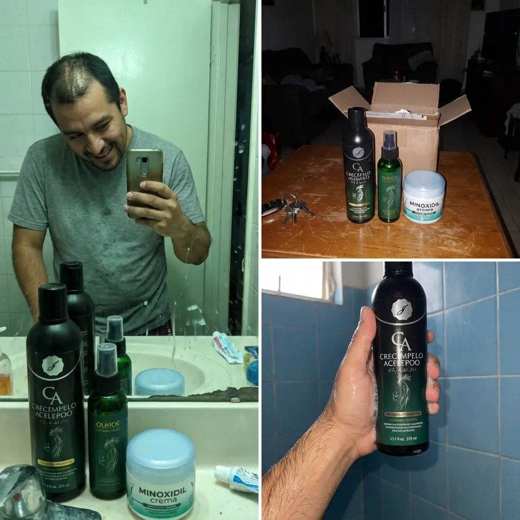 Reactivamos folículos inactivos con Minoxidil, la base científica, mientras el shampoo y elixir crean el ambiente perfecto para un crecimiento denso y acelerado.